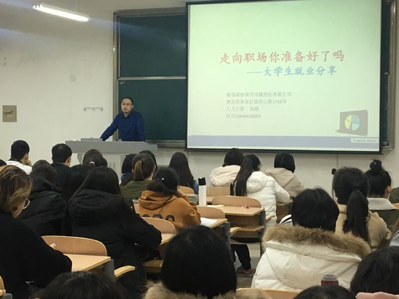 11月15日下午,青岛海容商用冷链股份有限公司人力资源部主管杨健来我院明水校区1104做就业指导讲座,讲座主题为“走向职场你准备好了么”,市场营销专业和房地产开发与管理专业学生参加了讲座。