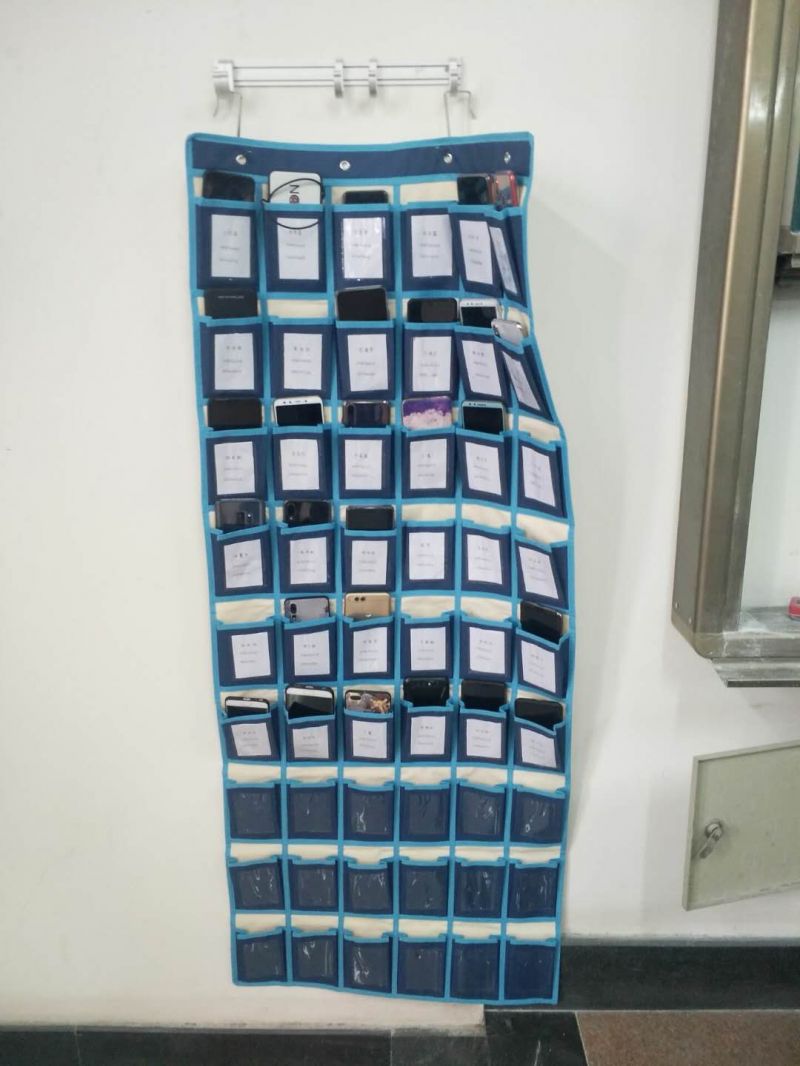 海角视频 给每个班级发放了一个手机收纳袋,上课前,学生将手机放进各自“专属”的手机袋里,每个手机袋上都标有姓名和学号, 整个手机收纳袋由各班班长保管。“无手机课堂活动”既可以防止学生上课玩手机,而且哪个学生旷课,检查下手机袋就一目了然。