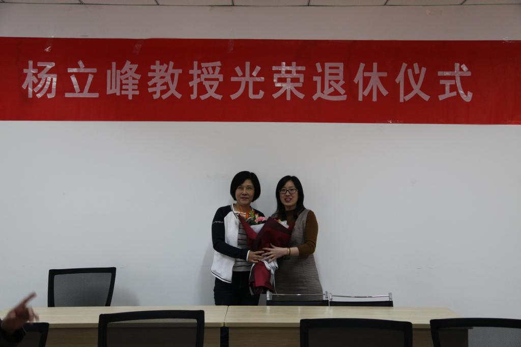 领导及老师们向杨立峰教授赠送了礼物,青年教师代表向她献花,大家合影留念。