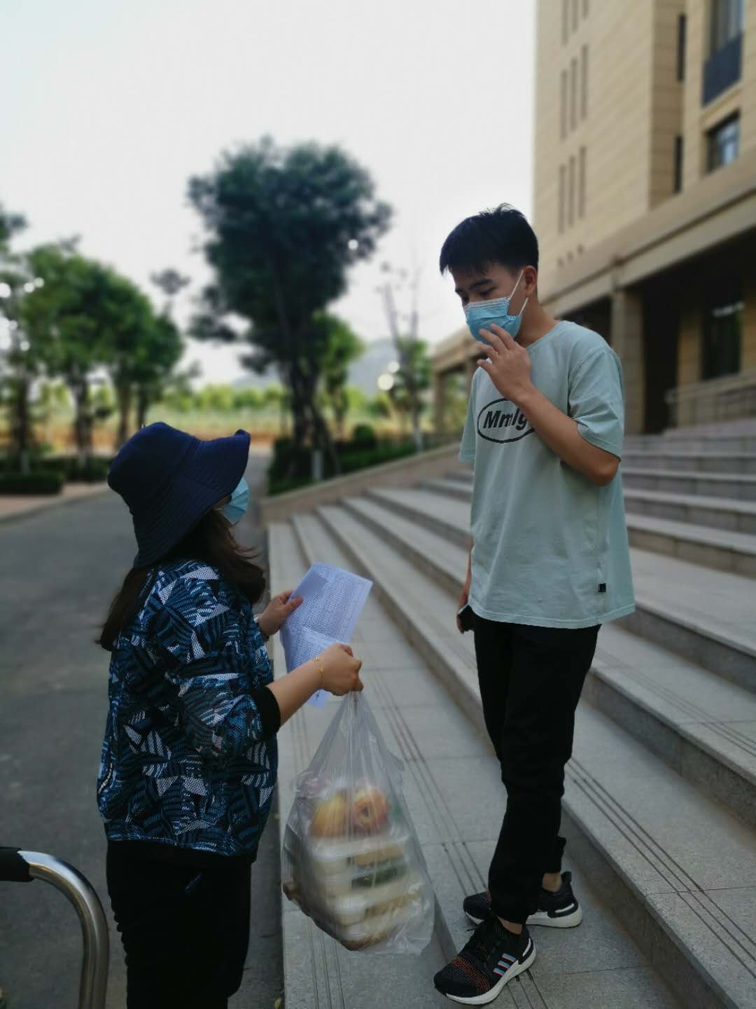 这份温度来源于辅导员老师亲自把饭菜送到我们的手中。”