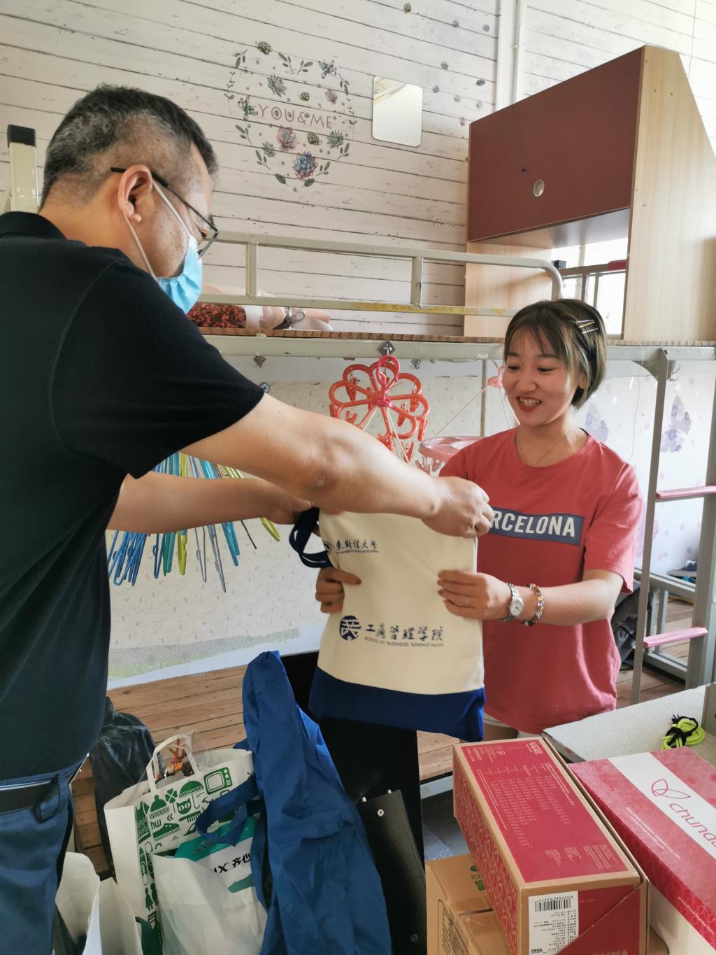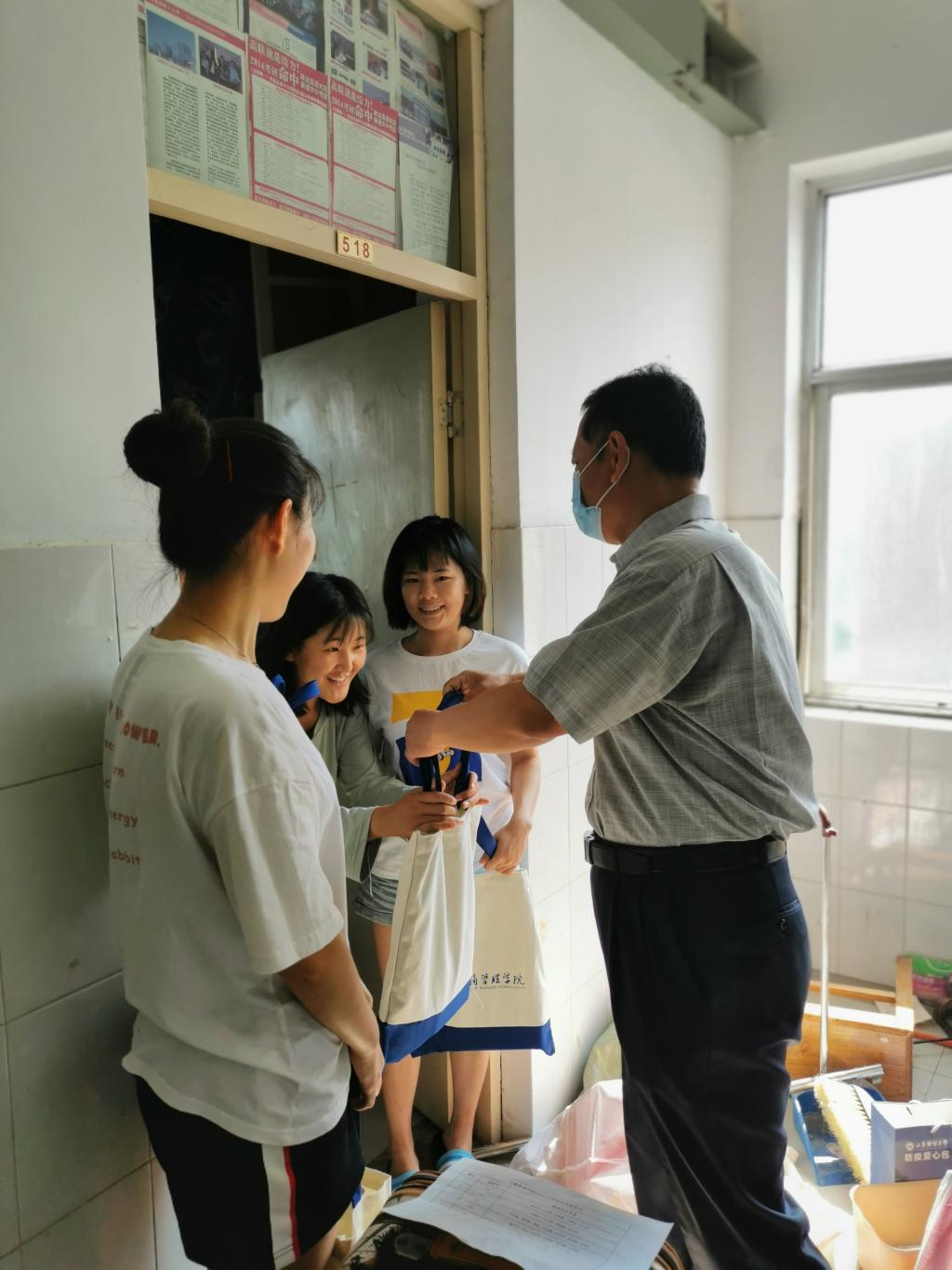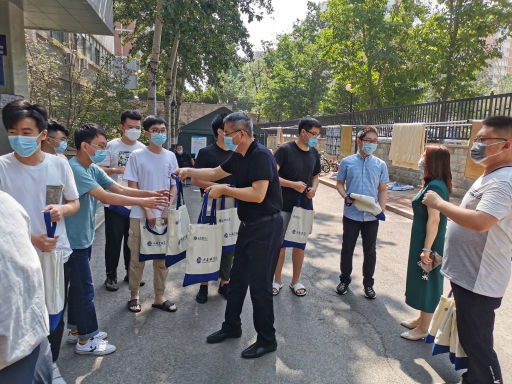 领导和老师奔走在本、硕毕业生的四栋宿舍楼,将精心准备的“毕业大礼包”亲自送到毕业生手上。