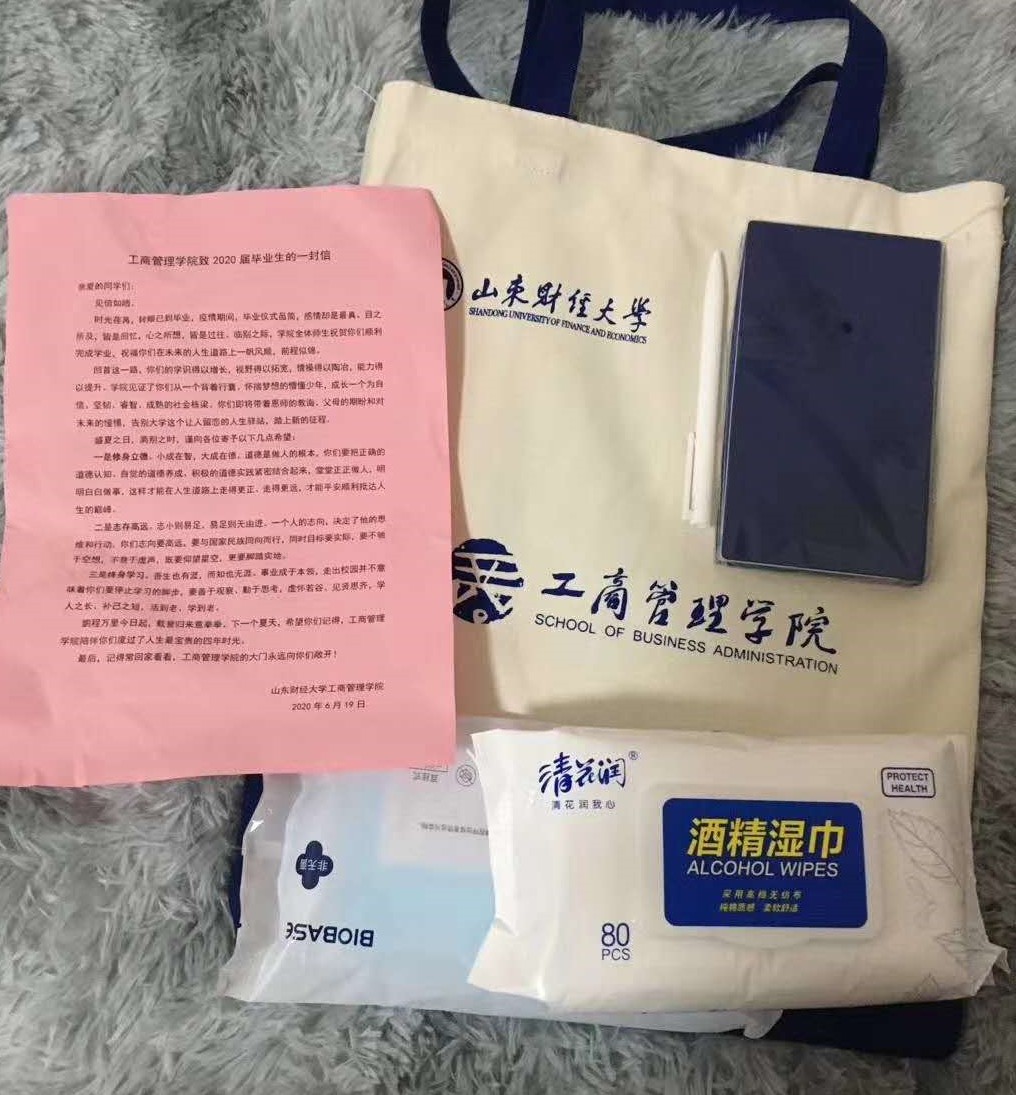 同学们纷纷表示,这是他们收到的最暖心的毕业礼物,心中满满的都是惊喜与感动。2016级人力资源管理1班的董天宇说:“ 路上注意安全,乘坐公共交通工具有风险,一定要戴好口罩,接触把手前先拿湿巾擦一擦。总想着送你们些什么,但还是觉得消毒湿巾和口罩用得上,还有海角视频