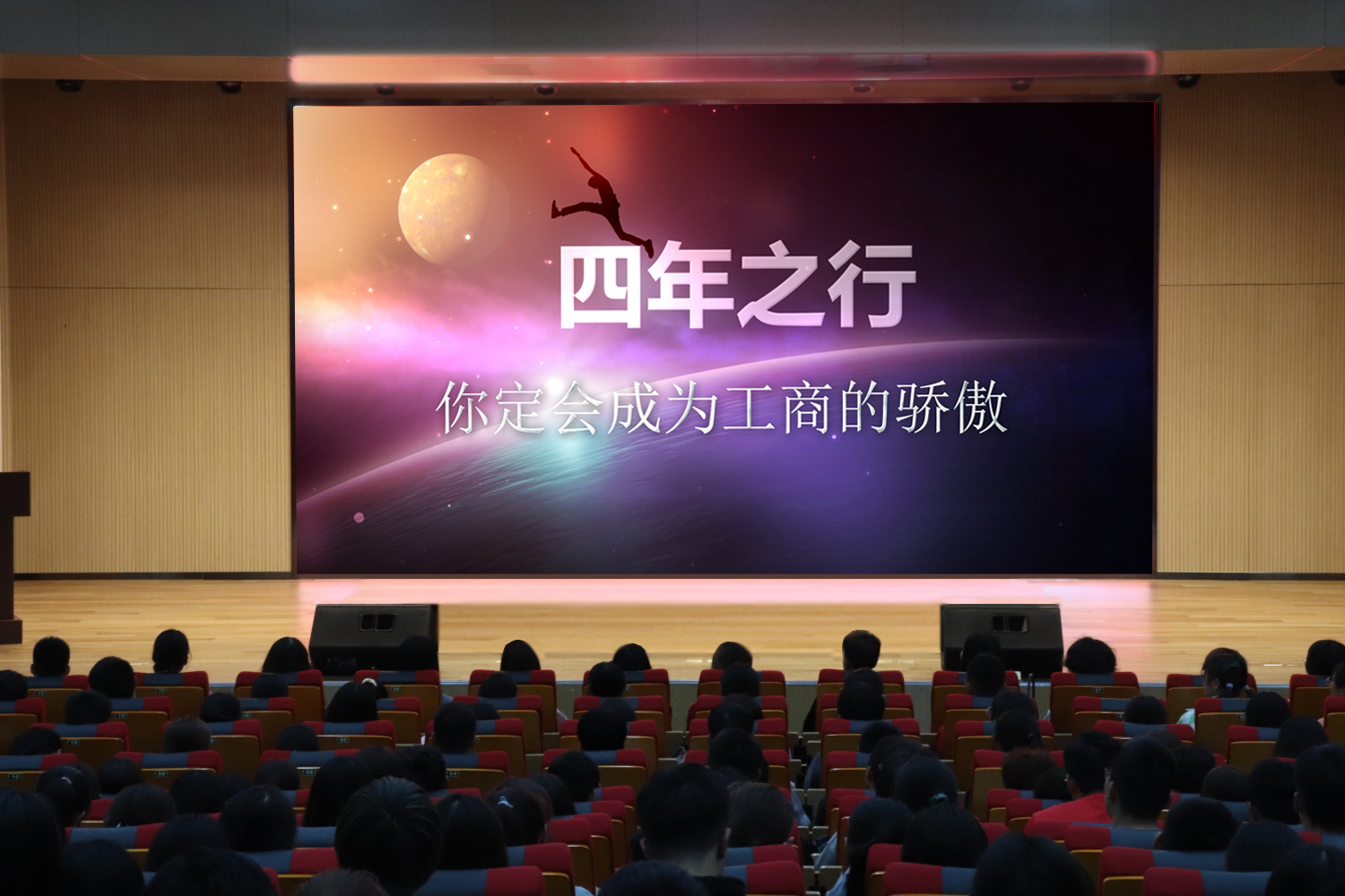 的雄厚实力;以优秀师生为切入点,塑造典型工商榜样,新生影像与榜样留影在荧幕上重叠交映,“四年之行,你定会成为工商的骄傲”定格荧幕,引发全场热烈掌声。