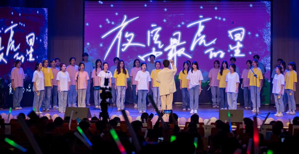 十年树木,百年树人,在山财工商校友的祝福视频中,他们分享与母校的温暖记忆的同时也表达着对学弟学妹以及母校的衷心祝福,勉励同学们坚定专业信仰,努力学习,厚积薄发;校友和辅导员老师共同朗诵《相望里的成长》,铿锵有力的声音中寄予了对母校的热爱和对工商学子的殷殷期盼;青春不止有《夜空中最亮的星》的璀璨夺目更有《小城夏天》中的浪漫余晖和青春点滴美好;晚会在全体演职人员合唱的《开心往前飞》落下帷幕,回声激荡,真挚动人,在场师生激情合唱,全场气氛在高昂的歌声中再次奔向了高潮。