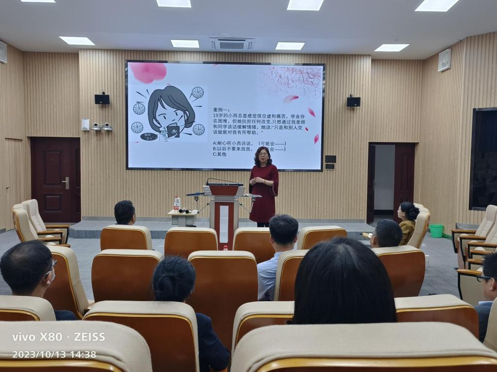 赵凌云长期从事高校心理素质教育与心理咨询工作,在此次报告中,赵老师结合学生管理工作的实际从“心理健康的标准、积极关注的智慧、有效的沟通方式、有效的沟通技巧”等方面进行了阐述。她指出,辅导员与学生的沟通中,要立足当下学生需求和特点,要建立工作的边界感;同时,在沟通中要专注于来访者,掌握赞美、倾听、共情、忠告等技术方法。赵老师结合自身的经验,通过对大学生心理危机干预的个案分析,呈现如何在日常工作中运用心理学的知识和技能正确处理学生的心理问题。