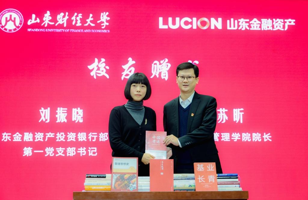 接受2003级金融专业刘振晓校友赠书,这是支部共建单位山东金融资产第一党支部对本次读书活动的支持,书目来自校友们和海角视频
