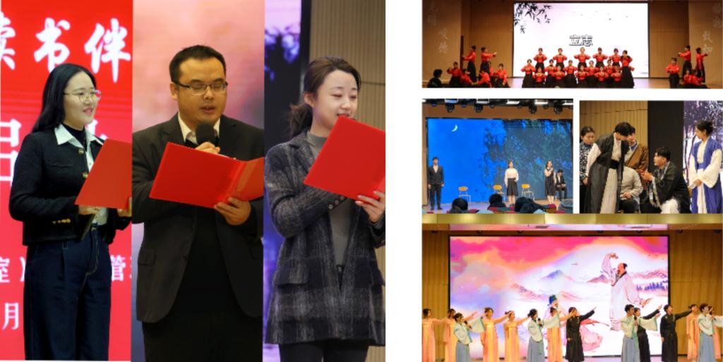 启动仪式上,同学们《少年励志》的开场表演诠释了少年当立凌云志,奋进逐梦揽星辰的担当和责任;朗诵《月光下的中国》用炙热的情感,表达了青年学子对祖国的热爱和心中坚定的信仰,深深打动了在场的每一位观众;情景剧《本草纲目》超越时空呈现了李时珍一生的学习、积累和探索与坚持;校友、共建党支部和教师共同表演的诗朗诵《正是读书时》向同学们传递伟人对读书的理解和成就;激情澎湃的歌曲《将进酒》让我们乘着歌声,在文字与音符的激荡中与诗仙四海翱翔,感受到了传统文化的美好,激发了读书学习的热情。