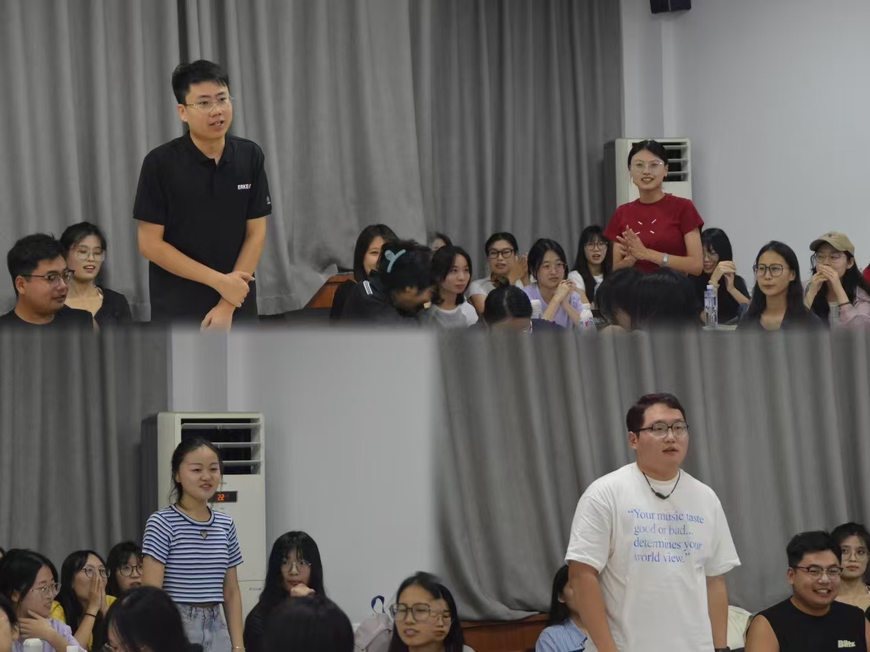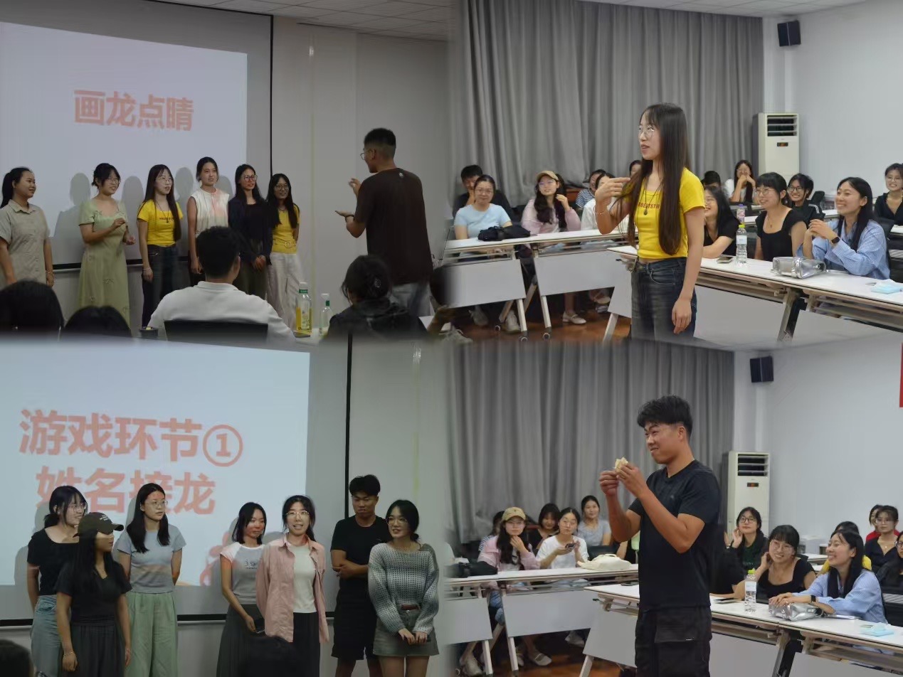 游戏环节更是让大家彻底放松下来。“你来比划我来猜”,表演的同学动作惟妙惟肖,猜词的同学们齐心协力踊跃抢答,其他同学们在一旁欢呼助力,虽然是初次见面,大家还是仿佛早有默契。“姓名接龙”,每组围成一圈,第一个人说出自己的名字后加一个动作,下一个人需要先重复前一个人的名字和动作,再加上自己的名字和新动作,依次类推。现场气氛热烈,同学们的感情也快速升温。