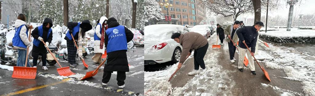 闻令而动,迎雪而行。寒风中,师生手持铁锹、扫帚等工具分工协作:有的躬身挥锹,将路面坚冰逐一敲碎;有的手执扫帚,将松散积雪清扫归拢;有的合力抬运,将堆积厚雪转运至绿化带等安全区域。章丘校区先锋队对教学楼出入口、食堂周边等人员密集区域开展精细化清雪;燕山校区先锋队则聚焦坡道、台阶等易滑节点进行反复除冰。凛冽寒风冻红了指尖,却挡不住师生的热忱,此起彼伏的协作声让冬日校园涌动着融融暖意。