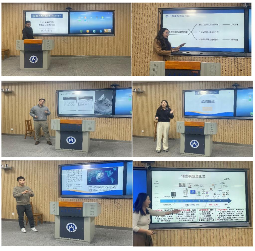 朱沛宇、范蕾、张恒、杜双、王涛、吴忻冉6位青年教师分别进行15分钟的教学展示。庄玉梅、耿新、费振国、于潇对青年教师的教学展示进行了细致点评,并从教学设计、内容组织、案例运用等方面提出了一系列建设性意见。