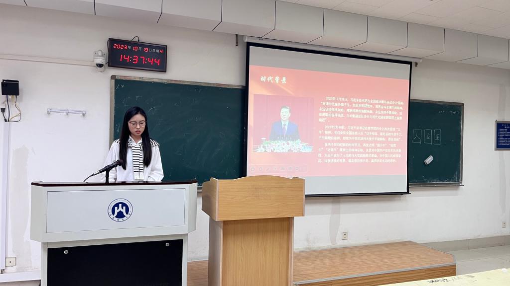 随后,许梦晴同学进一步分享了“三牛”精神的科学内涵。“为民服务孺子牛”意味着时刻坚定以人民为中心的发展思想,自觉地同人民想在一起、走在一起、干在一起。“创新发展拓荒牛”意味着永远保持闯的精神、闯的劲头、干的作风。“艰苦奋斗老黄牛”意味着将奋斗落到实处,以苦干实干、任劳任怨铸就美好幸福生活。