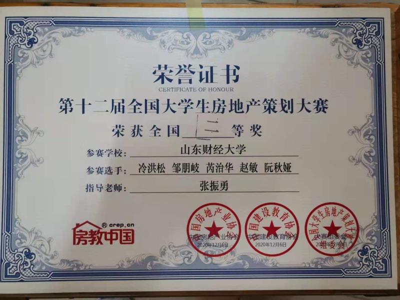 2017级房地产开发与管理专业(二)班的冷洪松、赵敏、阮秋娅、邹朋岐、芮治华同学在房地产系张振勇、谭继存、徐海燕、巩琴贤等老师的指导下,获得了全国前20%的好成绩,并荣获华北区域赛一等奖、全国总决赛二等奖。在此次大赛中,他们充分调动专业知识,秉承创新与实践精神,不畏挑战,乘风破浪,展现了自己和团队的锋芒。